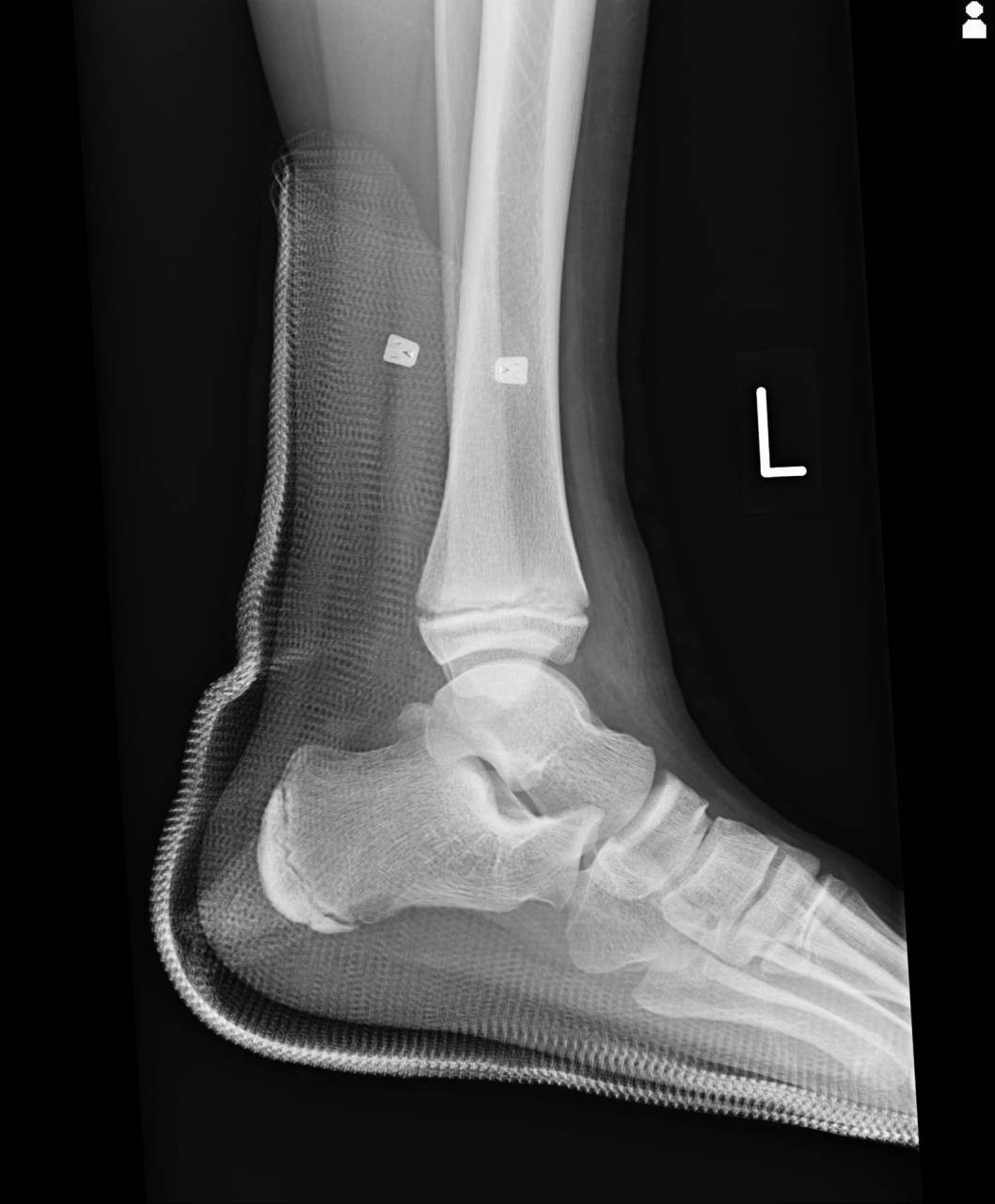 外見上は左距腿関節周辺にかなり腫脹(腫れ)があり、皮下出血はこの時点では出現していませんでした(皮下出血は翌日に少し出現していて、受傷3日目には青く出現していました)。