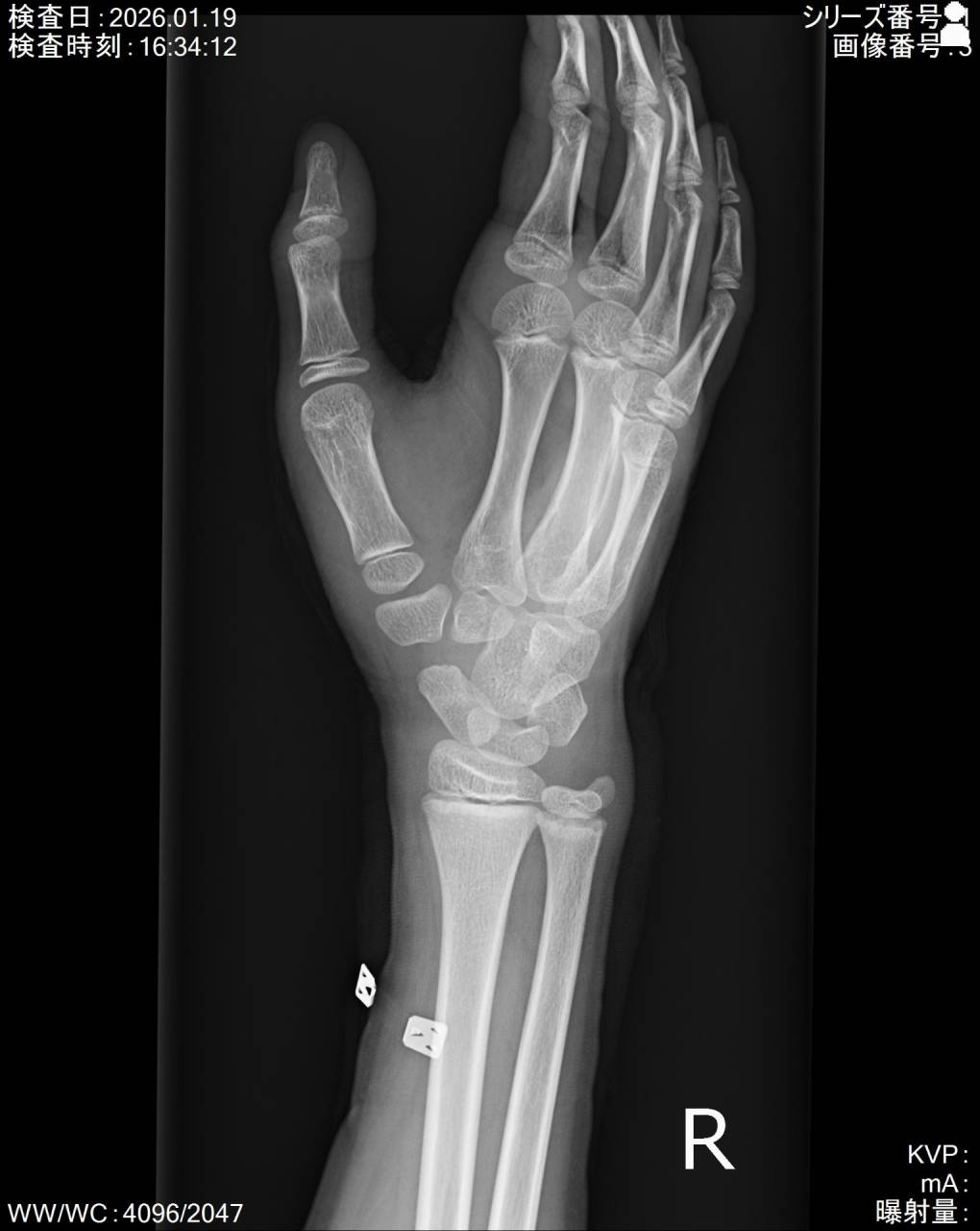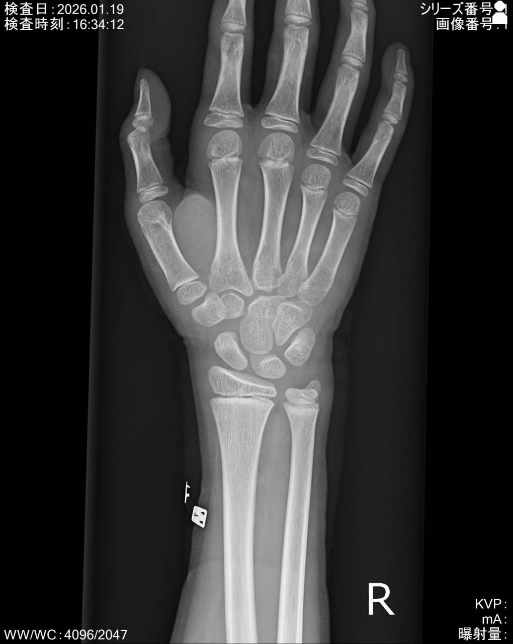 右手の外見は皮下出血は無く、腫脹がよく見るとあります。